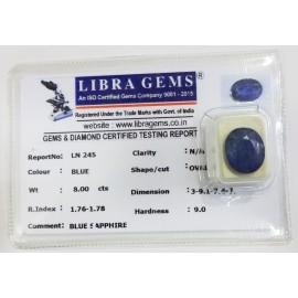 REPORT.NO.-LN 245CLARITY.-N/ACOLOUR.-BLUESHAPE/CUT.-OVALWT.-8.00 CTSDIMENSION.-3-9.1-7.4-7.R.INDEX.-1.76-1.78HARDNESS.-9.0COMMENT.-BLUE SAPPHIRE..