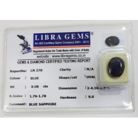 REPORT.NO.-LN 278CLARITY.-N/ACOLOUR.-BLUESHAPE/CUT.-OVALWT.-8.08 CTSDIMENSION.-2-4.10-2.6-1.R.INDEX.-1.76-1.78HARDNESS.-9.0COMMENT.-BLUE SAPPHIRE..