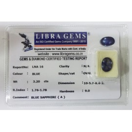 REPORT NO . LNA 16CLARITY . N/ACOLOUR . BLUESHAPE / CUT . OVALWT . 3.20 CTSDIMENSION . 10-5.7-8.4-2.R . INDEX . 1.76-1.78HARDNESS . 9.0COMMENT . BLUE SAPPHIRE { A }..