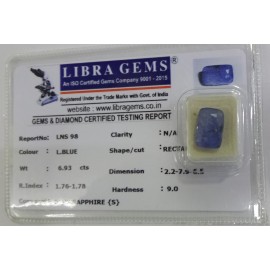 REPORT.NO.-LNS 98CLARITY.-N/ACOLOUR.-L. BLUESHAPE/CUT.-RECTANGLEWT.-6.93 CTSDIMENSION.-2-2.7-9.6-5.R.INDEX.-1.76-1.78HARDNESS.-9.0COMMENT.-BLUE SAPPHIRE { S }..