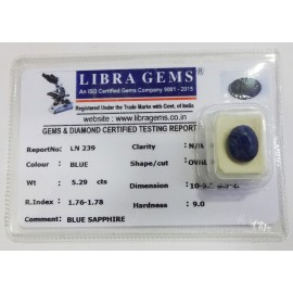 REPORT.NO.-LN 239CLARITY.-N/ACOLOUR.-BLUESHAPE/CUT.-OVALWT.-5.29 CTSDIMENSION.-10-9.8-8.5-2.R.INDEX.-1.76-1.78HARDNESS.-9.0COMMENT.-BLUE SAPPHIRE..