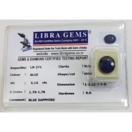 REPORT.NO.- LN 271CLARITY.-N/ACOLOUR.-BLUESHAPE/CUT.-OVALWT.-6.14 CTSDIMENSION.-1-1.10-2.5-8.R.INDEX.-1.76-1.78HARDNESS.-9.0COMMENT.-BLUE SAPPHIRE..