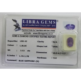 REPORT.NO.-LNS 43CLARITY.-N/ACOLOUR.-L. BLUESHAPE/CUT.-OVALWT.-3.52 CTSDIMENSION.-10-5.6-7.5-7.R.INDEX.-1.76-1.78HARDNESS.-9.0COMMENT.-BLUE SAPPHIRE { S }..