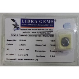 REPORT.NO.-LNS 88CLARITY.-N/ACOLOUR.-L. BLUESHAPE/CUT.-OVALWT.-6.63 CTSDIMENSION.-10-6.9-4.6-7.R.INDEX.-1.76-1.78HARDNESS.-9.0COMMENT.-BLUE SAPPHIRE { S }..