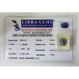 REPORT NO . LNS 13CLARITY . N/ACOLOUR . L . BLUESHAPE / CUT . OVALWT . 3.83 CTSDIMENSION . 8-7.9-1.5-1.R . INDEX . 1.76-1.78HARDNESS . 9.0COMMENT . BLUE SAPPHIRE { S }..