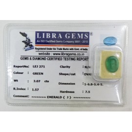 REPORT.NO.LEJ 271CLARITY.N/ACOLOUR.GREENSHAPE/CUT.OVALWT.3.07 CTSDIMENSION.1.6-8.5-4.5R.INDEX.1.57HARDNESS.7.5COMMENT.EMERALD {J}..