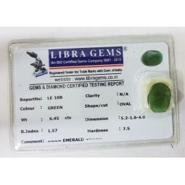 REPORT NO . LE 108CLARITY . N/ACOLOUR . GREENSHAPE / CUT . OVALWT . 6.45 CTSDIMENSION . 5-2.1-6.4-9.R . INDEX . 1.57HARDNESS . 7.5COMMENT . EMERALD..