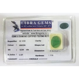 REPORT NO . LE 132CLARITY . N/ACOLOUR . GREENSHAPE / CUT . OVALWT . 5.54 CTSDIMENSION . 4-4.1-1.4-4.R . INDEX . 1.57HARDNESS . 7.5COMMENT . EMERALD..