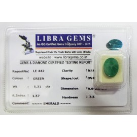 REPORT.NO.LE 442CLARITY.N/ACOLOUR.GREENSHAPE/CUT.OVALWT.5.31 CTSDIMENSION . 9-9.2-9.6-3.R.INDEX.1.57HARDNESS.7.5COMMENT.EMERALD..