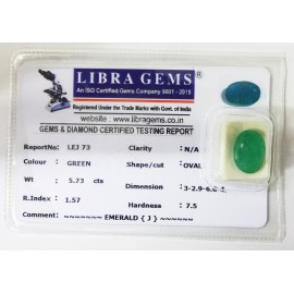 REPORT NO . LEJ 73CLARITY . N/ACOLOUR . GREENSHAPE / CUT . OVALWT . 5.73 CTSDIMENSION . 3-2.9-6.6-4.R . INDEX . 1.57HARDNESS . 7.5COMMENT . EMERALD { J }..