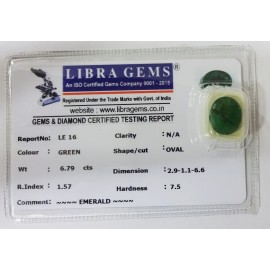 REPORT NO . LE 16CLARITY . N/ACOLOUR . GREENSHAPE / CUT . OVALWT . 6.79 CTSDIMENSION . 2-9.1-1.6-6.R . INDEX . 1.57HARDNESS . 7.5COMMENT . EMERALD..