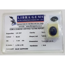 REPORT.NO.-LN 267CLARITY.-N/ACOLOUR.-BLUESHAPE/CUT.-OVALWT.-7.64 CTSDIMENSION.-2-2.10-1.6-3.R.INDEX.-1.76-1.78HARDNESS.-9.0COMMENT.-BLUE SAPPHIRE..