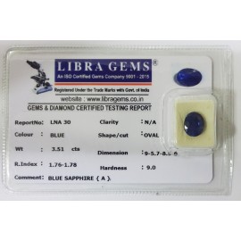 REPORT NO . LNA 30CLARITY . N/ACOLOUR . BLUESHAPE / CUT . OVALWT . 3.51 CTSDIMENSION . 9-5.7-8.5-6.R . INDEX . 1.76-1.78HARDNESS . 9.0COMMENT . BLUE SAPPHIRE { A }..