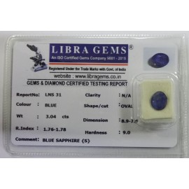 REPORT.NO.-LNS 31CLARITY.-N/ACOLOUR.-BLUESHAPE/CUT.-OVALWT.-3.04 CTSDIMENSION.-8-9.7-6.4-8.R.INDEX.-1.76-1.78HARDNESS.-9.0COMMENT.-BLUE SAPPHIRE { S }..