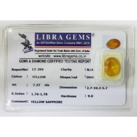 REPORT.NO.LY 399 CLARITY.N/ACOLOUR.YELLOWSHAPE/CUT.OVALWT.7.37DIMENSION.2.7-10.3-5.7R.INDEX.1.76-1.78HARDNESS.9.0COMMENT.YELLOW SAPPHIRE..