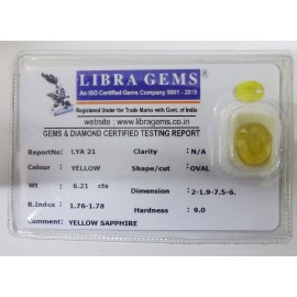 REPORT NO . LYA 21CLARITY . N/ACOLOUR . YELLOWSHAPE / CUT . OVALWT . 6.21 CTSDIMENSION . 2-1.9-7.5-6.R . INDEX . 1.76-1.78HARDNESS . 9.0COMMENT . YELLOW SAPPHIRE..