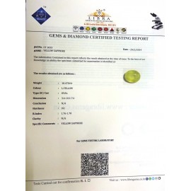 REPORT NO . LYA 51CLARITY . N/ACOLOUR . YELLOWSHAPE / CUT . OVALWT . 3.35 CTSDIMENSION . 10-3.8-4.4-4.R . INDEX . 1.76-1.78HARDNESS . 9.0COMMENT . YELLOW SAPPHIRE { A }..