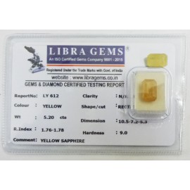 REPORT.NO.LY 612CLARITY.N/ACOLOUR.YELLOWSHAPE/CUT.RECTANGLE WT.5.20 CTSDIMENSION.10.5-7.2-5.3R.INDEX.1.76-1.7.8HARDNESS.9.0COMMENT.YELLOW SAPPHIRE..