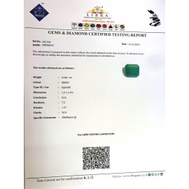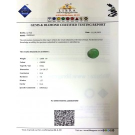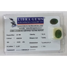 REPORT NO . LE 88CLARITY . N/ACOLOUR . GREENSHAPE / CUT . OVALWT . 4.82 CTSDIMENSION . 2-4.9-5.5-7.R . INDEX . 1.57HARDNESS . 7.5COMMENT . EMERALD..