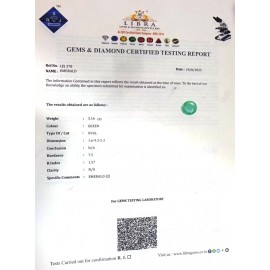 DATE:2025REF.NO:LEJ 378NAME:EMERALDWEIGHT:3.16 CTSCOLOUR:GREENTYPE OF/CUT:OVALDIMENSION:1-6.9-3.5-3.CONCLUSION:N/AHARDNESS:7.5R.INDEX:1.57CLARITY:N/ASPECIFIC COMMENTS:EMERALD {Z}..