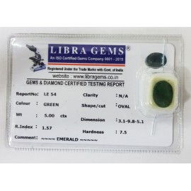 REPORT NO . LE 54CLARITY . N/ACOLOUR . GREENSHAPE / CUT . OVALWT . 5.00 CTSDIMENSION . 3-1.9-8.5-1.R . INDEX . 1.57HARDNESS . 7.5COMMENT . EMERALD..