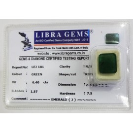 REPORT.NO.-LEJ 181CLARITY.-N/ACOLOUR.-GREENSHAPE/CUT.-RECTANGLEWT.-6.40 CTSDIMENSION.-2-3.10-7.5-5.R.INDEX.-1.57HARDNESS.-7.5COMMENT.-EMERALD { J }..