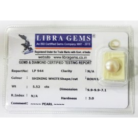 REPORT NO . LP 944CLARITY . N/ACOLOUR . SHINING WHITESHAPE / CUT . ROUNDWT . 5.52 CTSDIMENSION . 9-9.9-9.7-1.R . INDEX . N/AHARDNESS . 3.0COMMENT . PEARL..