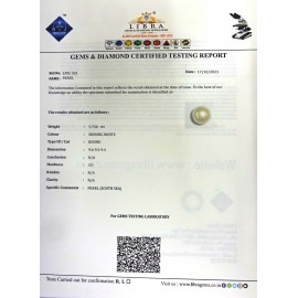 REPORT NO . LP 528CLARITY . N/ACOLOUR . SHINING WHITESHAPE / CUT . ROUNDWT . 6.08 CTSDIMENSION . 10-1.10-3.7-1.R . INDEX . N/AHARDNESS . 3.0COMMENT . PEARL..