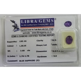REPORT.NO.-LNS 46CLARITY.-N/ACOLOUR.-L. BLUESHAPE/CUT.-OVALWT.-3.68 CTSDIMENSION.-9-6.8-6.4-7.R.INDEX.-1.76-1.78HARDNESS.-9.0COMMENT.-BLUE SAPPHIRE { S }..