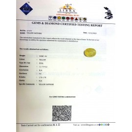 DATE: 9-4-2025REF.NO: LY 1785NAME: YELLOW SAPPHIREWEIGHT: 5.21 CTSCOLOUR: L.YELLOWTYPE OF/CUT: OVALDIMENSION: 10.6-7.9-6.3/CONCLUSION: N/AHARDNESS: 9.0R.INDEX: 1.76-1.78CLARITY: N/ASPECIFIC COMMENTS: ..