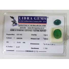 REPORT NO . LEJ 62CLARITY . N/ACOLOUR . GREENSHAPE / CUT . OVALWT . 5.03 CTSDIMENSION . 2-7.10-5.6-1.R . INDEX . 1.57HARDNESS . 7.5COMMENT . EMERALD { J }..