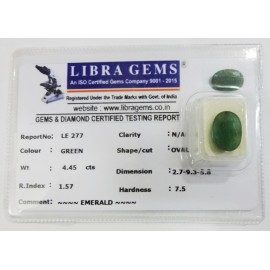 REPORT.NO.-LE 277CLARITY.-N/ACOLOUR.-GREENSHAPE/CUT.-OVALWT.-4.45 CTSDIMENSION.-2-7.9-3.5-8.R.INDEX.-1.57HARDNESS.-7.5COMMENT.-EMERALD..
