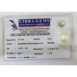 REPORT NO . LP 253CLARITY . N/ACOLOUR . SHINING WHITESHAPE / CUT . ROUNDWT . 8.70 CTSDIMENSION . 1-6.8-1.1-6.R . INDEX . N/AHARDNESS . 3.0COMMENT . PEARL..