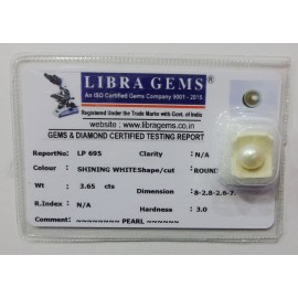 REPORT NO . LP 695CLARITY . N/ACOLOUR . SHINING WHITESHAPE / CUT . ROUNDWT . 3.65 CTSDIMENSION . 8-2.8-2.6-7.R . INDEX . N/AHARDNESS . 3.0COMMENT . PEARL..
