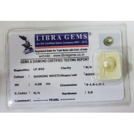 REPORT NO . LP 850CLARITY . N/ACOLOUR . SHINING WHITESHAPE / CUT . ROUNDWT . 4.08 CTSDIMENSION . 9-1.6-5.9-1.R . INDEX . N/AHARDNESS . 3.0COMMENT . PEARL..