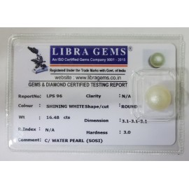 REPORT NO . LPS 96CLARITY . N/ACOLOUR . SHINING WHITESHAPE / CUT . ROUNDWT . 16.48 CTSDIMENSION . 3-1.3-1.3-1.R . INDEX . N/AHARDNESS . 3.0COMMENT . C / WATER PEARL { SOSI }..