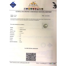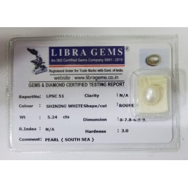 REPORT NO . LPSC 51CLARITY . N/ACOLOUR . SHINING WHITESHAPE / CUT . ROUNDWT . 5.24 CTSDIMENSION . 8-7.8-6.9-9.R . INDEX . N/AHARDNESS . 3.0COMMENT . PEARL { SOUTH SEA }..