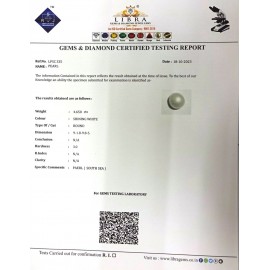 REPORT.NO.LPSC 108CLARITY.N/ACOLOUR.SHINING WHITESHAPE/CUT.ROUND WT.6.15 CTSDIMENSION.9.8-9.5-9.5R.INDEX.N/AHARDNESS.3.0COMMENT.PEARL {SOUTH SEA}..