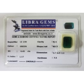 REPORT.NO.-LE 230CLARITY.-N/ACOLOUR.-GREENSHAPE/CUT.-RECTANGLEWT.-4.45 CTSDIMENSION.-2-2.8-8.4-9.R.INDEX.-1.57HARDNESS.-7.5COMMENT.-EMERALD..