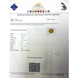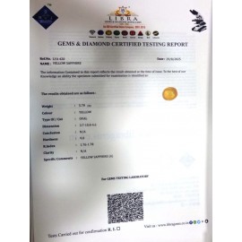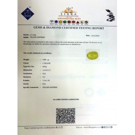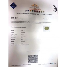 REPORT NO . LY 340CLARITY . N/ACOLOUR . YELLOWSHAPE / CUT . OVALWT . 3.19 CTSDIMENSION . 8-7.7-5.4-7.R . INDEX . 1.76-1.78HARDNESS . 9.0COMMENT . YELLOW SAPPHIRE..