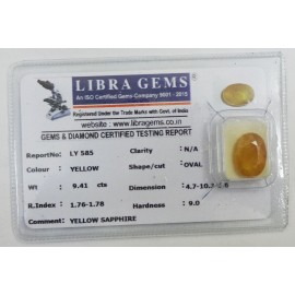 REPORT.NO.LY 585CLARITY.N/ACOLOUR.YELLOWSHAPE/CUT.OVAL WT.9.41 CTSDIMENSION.4.7-10.3-5.6R.INDEX.1.76-1.7.8HARDNESS.9.0COMMENT.YELLOW SAPPHIRE..