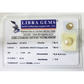 REPORT.NO-LP 871CLARITY-N/ACOLOUR-SHINING WHITESHAPE/CUT-ROUNDWT-3.98 CTSDIMENSION-8.9-8.9-6.6R.INDEX-N/AHARDNESS-3.0COMMENT-PEARL..