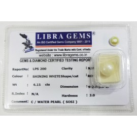 REPORT NO . LPS 200CLARITY . N/ACOLOUR . SHINING WHITESHAPE / CUT . ROUNDWT . 6.15 CTSDIMENSION . 9-2.9-5.9-2.R . INDEX . N/AHARDNESS . 3.0COMMENT . C / WATER PEARL { SOSI }..