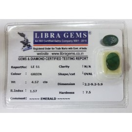 REPORT NO . LE 51CLARITY . N/ACOLOUR . GREENSHAPE / CUT . OVALWT . 4.57 CTSDIMENSION . 2-2.9-2.5-9.R . INDEX . 1.57HARDNESS . 7.5COMMENT . EMERALD..