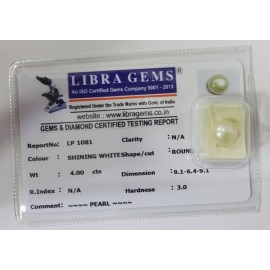 REPORT NO . LP 1081CLARITY . N/ACOLOUR . SHINING WHITESHAPE / CUT . ROUNDWT . 4.00 CTSDIMENSION . 9-1.6-4.9-1.R . INDEX . N/AHARDNESS . 3.0COMMENT . PEARL..