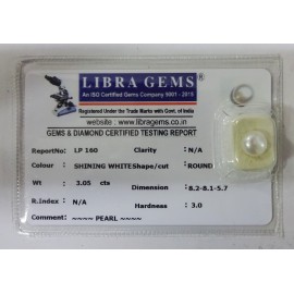 REPORT NO . LP 160CLARITY . N/ACOLOUR . SHINING WHITESHAPE / CUT . ROUNDWT . 3.05 CTSDIMENSION . 8-2.8-1.5-7.R . INDEX . N/AHARDNESS . 3.0COMMENT . PEARL..
