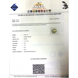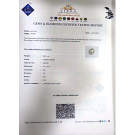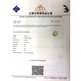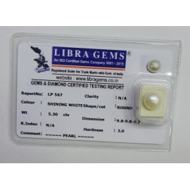 REPORT NO . LP 567CLARITY . N/ACOLOUR . SHINING WHITESHAPE / CUT . ROUNDWT . 5.30 CTSDIMENSION . 9-8.9-8.6-7.R . INDEX . N/AHARDNESS  3.0COMMENT . PEARL..