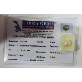 REPORT NO . LP 789CLARITY . N/ACOLOUR . SHINING WHITESHAPE / CUT . ROUNDWT . 4.10 CTSDIMENSION . 8-8.8-9.6-6.R . INDEX . N/AHARDNESS . 3.0COMMENT . PEARL..