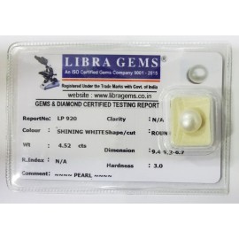 REPORT.NO-LP 920CLARITY-N/ACOLOUR-SHINING WHITESHAPE/CUT-ROUNDWT-4.52 CTSDIMENSION-9.4-9.2-6.7R.INDEX-N/AHARDNESS-3.0COMMENT-PEARL..