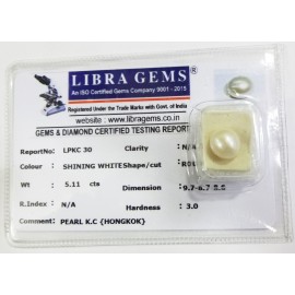 REPORT.NO.-LPKC 141CLARITY.-N/ACOLOUR.-SHINING WHITESHAPE/CUT.-ROUNDWT.-5.01 CTSDIMENSION.-9-4.9-4.9-4.R.INDEX.-N/AHARDNESS.-3.0COMMENT.-PEARL K.C { HONGKOK }..